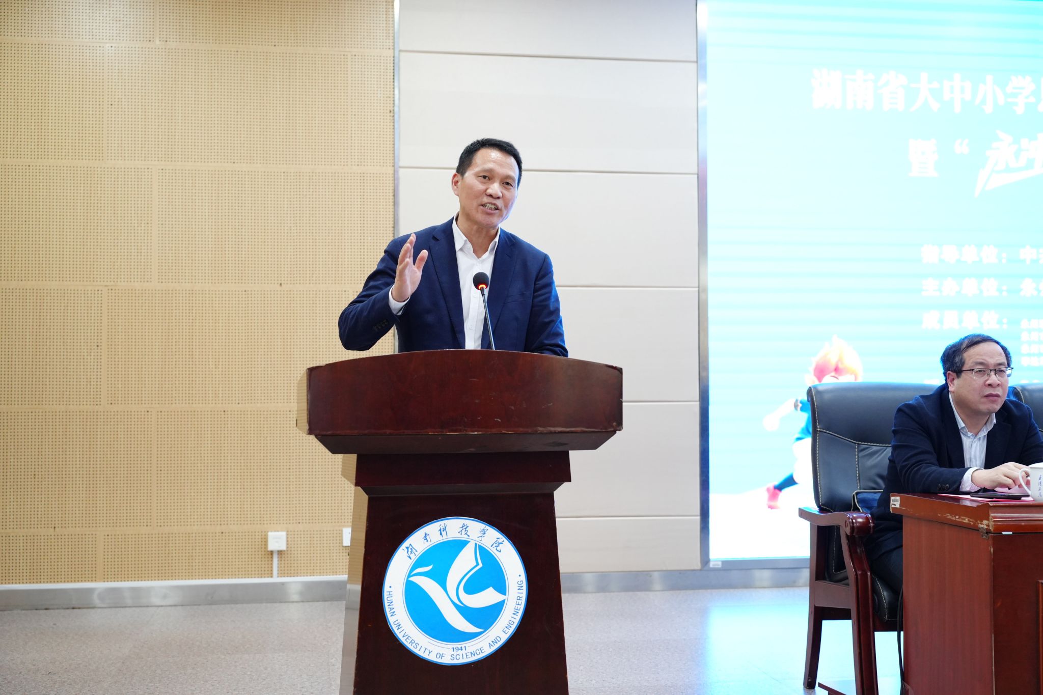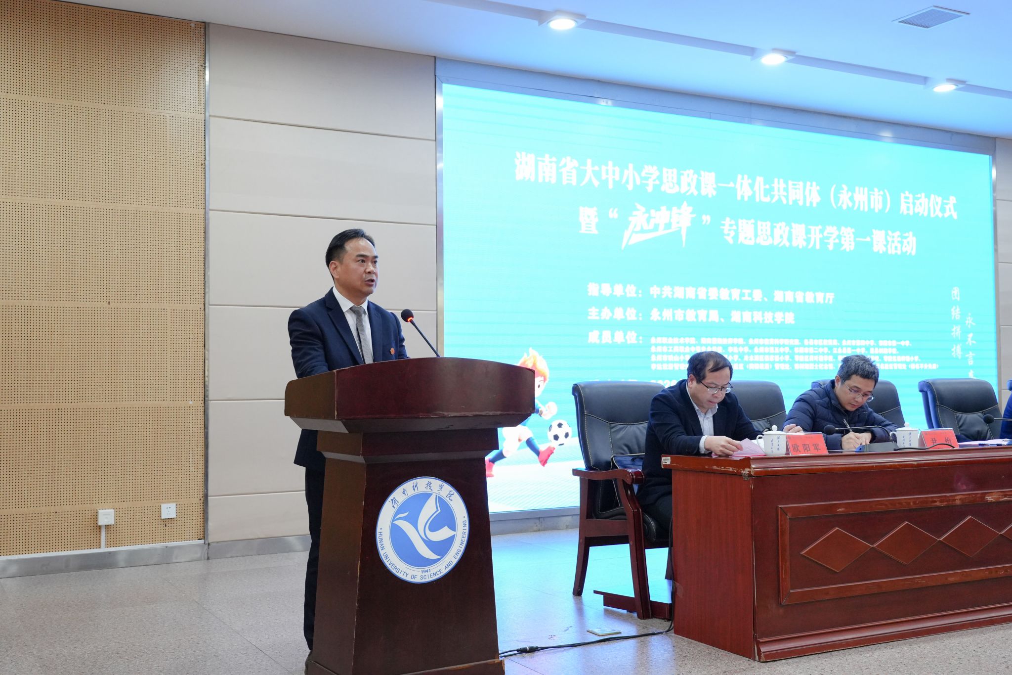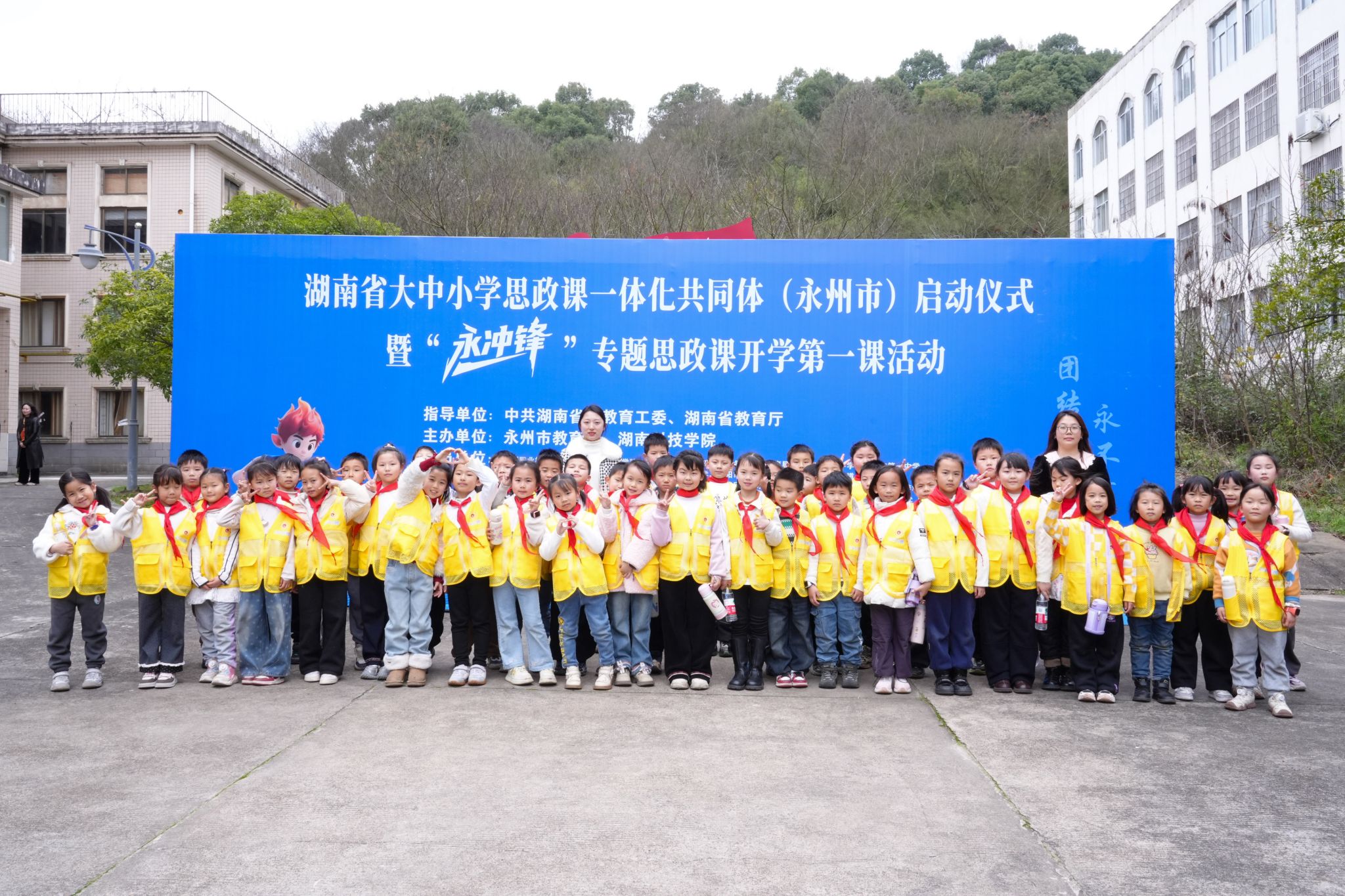 本网讯(记者 向薛峰 摄影 谢志豪)春潮涌动启新程,思政铸魂育新人。3月5日,湖南省大中小学思政课一体化共同体(永州市)启动仪式暨“永冲锋”专题思政课开学第一课活动在我校举行。本次活动由中共湖南省委教育工委、湖南省教育厅指导,永州市教育局与我校联合主办,省委教育工委委员、省教育厅党组成员余伟良,永州市人民政府副市长肖质彬,我校党委副书记、校长黄创霞等领导出席活动。