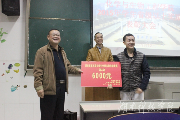 据悉,此次受表彰的同学包括在湖南省第五届大学生化学实验技能竞赛、湖南省大学生挑战杯和互联网+等省级比赛等获奖的同学,其中,化学实验技能竞赛所获得的两个省级一等奖填补了学校在该项历届赛事上一等奖的空白。