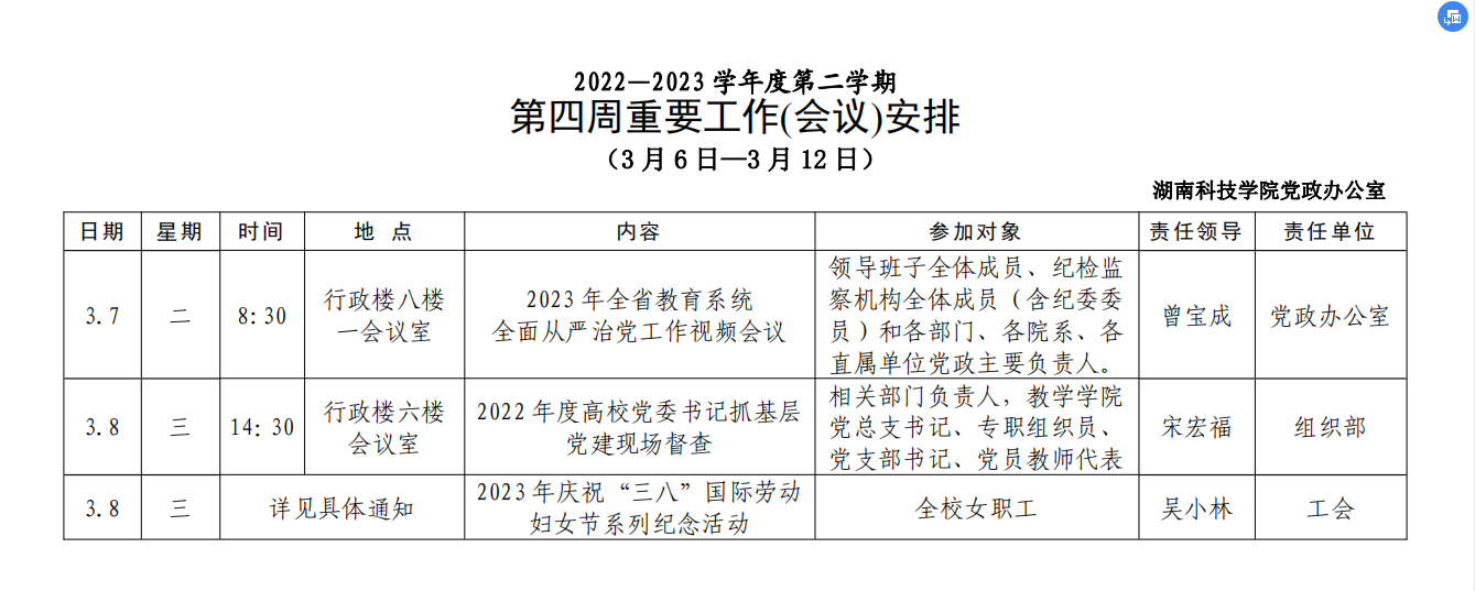 [党政办]第四周重要工作(会议)安排 (3月6日—3月12日)