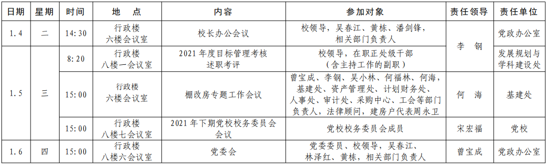 [党政办]2021—2022 学年度第一学期 第十九周重要工作(会议)安排 (1 月 3 日—1 月 9 日)